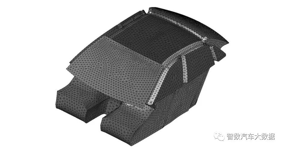 目前,国内外学者对车内乘员室噪声进行了广泛研究。其中,文献中采用混合FE-SEA方法预测了某乘用车车身前围板声学传递损失,并与测试结果进行综合比较,从而在全频段范围内,确定了结构优化区域。文献中在解决声腔声固耦合问题时,考虑了区间参数不确定因素,从而提高了混合FE-SEA方法的计算精度。文献中对某轿车车型建立了混合FE-SEA模型,通过试验对动力总成悬置激励和车身悬置激励进行了测量,对车内噪声进行了预测。文献中建立了车身侧围空腔阻隔结构的隔声性能预测模型,混合模型预测性能与试验结果对比表明,混合FE-SEA模型在中高频能有效预测阻隔结构隔声性能,而这些研究主要基于结构—声的计算探讨,还没有与湍流边界层脉动压力引起的气动噪声研究联系起来。文献中对列车地板铝型材建立了混合FE-SEA模型,并采用声桥技术、增加材料厚度等方式,显著降低了辐射噪声水平。文献中采用FE-BEM-SEA预测模型对发动机齿轮室盖结构噪声进行了深入研究,并采用均匀拓扑优化方法对其进行声学包装,获得了较为理想的降噪效果。文献[8]中依据某车型的统计能量分析模型与混合模型,采用钢化夹层玻璃与PMMA两种材料优化方案,达到了良好的降噪效果。综上所述,采用混合LES-FE-SEA方法,在汽车设计阶段准确预测具有高强度、全频段特性的气动噪声水平,并基于混合模型对车身子结构进行合理的声学优化或采取相应的降噪措施,对提升汽车自身品牌竞争力具有重大意义。