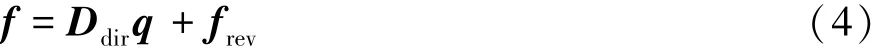 当车身板件的位移为q时,直接场在边界处产生的作用力为Ddirq,同时考虑到边界处的混响场载荷frev,边界处总的边界力为