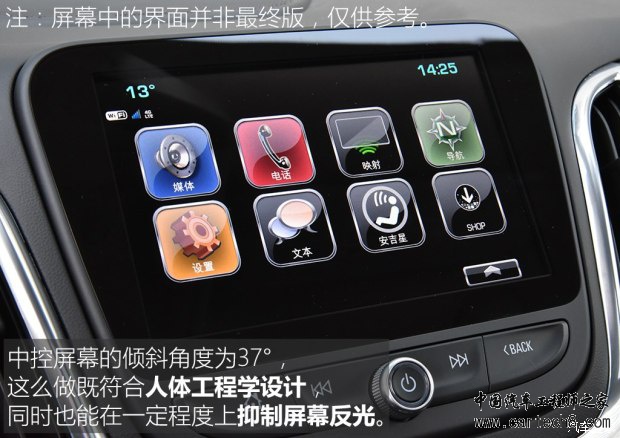 8英寸中控彩色触屏看似没有太大亮点,但实际上在设计上也考虑了人体工程学设计,倾角为37°。不仅可以让驾驶者轻松的触及屏幕上的各个位置,同时也能有效避免屏幕反光一片花白。