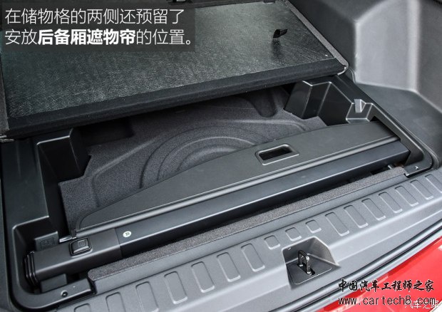 后备厢盖板下方还隐藏了一块高度为150mm的储物格,这块储物格可以用来防止球鞋、擦车毛巾等可能会影响后备厢整洁的小物件。此外左右还特别设计了凹槽,可以根据需求将后备厢遮物帘拆下收纳其中。
