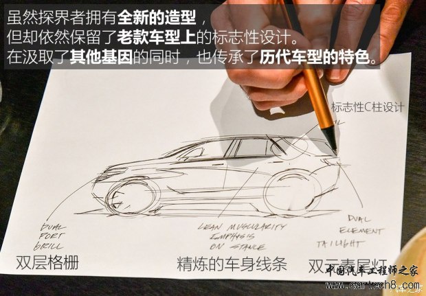 根据Holt Ware先生所说,科尔维特拥有动感、激情以及高性能等DNA,而索罗德代表着力量、强劲、实用和功能性。探界者则汲取了这两款车型的部分基因,作为中型SUV它拥有不错的空间及储物表现,这是功能性的体现。同时,在造型的设计上,它又具备动感、犀利的外观。
