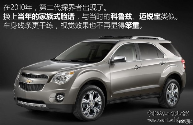 简单介绍下探界者的历史,虽然中国市场对于这款车会相对比较陌生,但实际上它已经是车系族谱上的第三代车型了。探界者的英文名为Equinox,初代车型于2005年诞生于美国市场,定位为中型SUV,硕大的车身有着典型的大块头美式风格。