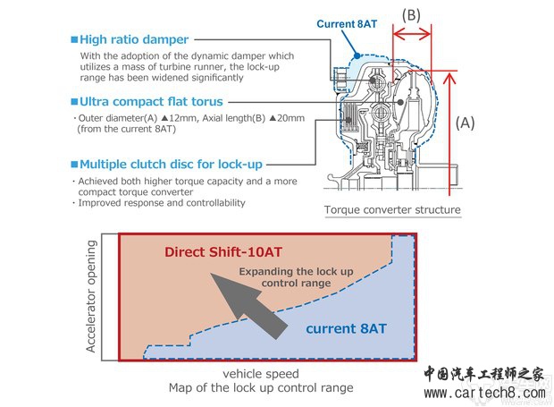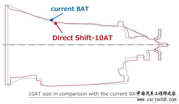 设计这个Direct Shift-8AT的时候,首先就是控制这款变速箱的体积,为此,爱信开发出新的扭力转换器,这个新的扭力转换器比起之前采用的还要更小,体积方面,这款8AT和现在6AT的体型上差不多而已。