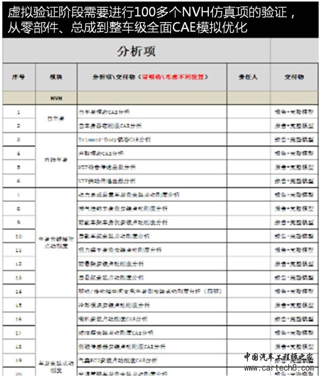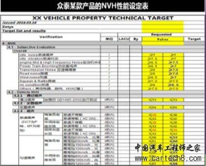 这个阶段主要就是对基础车型进行弱点分析,同时对竞品车车身、动力系统、底盘和悬架系统、空调系统以及电子系统等大类进行测量分析,并分成零部件设定目标,全车NVH可以细分出近千个目标,再分解到汽车各系统去,后面各系统零部件工程师开发时,也就朝着这个目标去努力。
