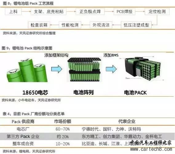 动力电池组系统是将众多单个的电芯通过串、并联的方式连接起来的电池组,综合了动力和热管理等电池硬件系统。Pack是动力电池系统生产、设计应用的关键,是连接上游电芯生产和下游整车的应用核心环节,通常设计需求由电芯厂或汽车厂提出,通常由电池厂、汽车厂或者第三方Pack厂完成。