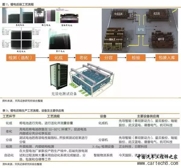 锂电后段生产工艺主要为分容、化成、检测和包装入库四道工序,占生产线价值量约35%。化成和分容作为后段工艺中最主要环节,对成型的电池进行激活检测,由于电池的充放电测试周期长,因此设备的价值量最高。化成工艺的主要作用在于将注液封装后的电芯充电进行活化,分容工艺则是在电池活化后测试电池容量及其他电性能参数并进行分级。化成和分容分别由化成机和分容机通常由自动化分容化成系统完成。