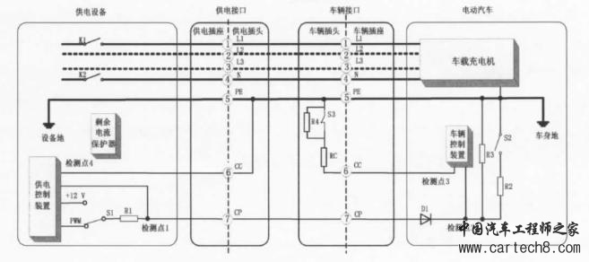 在GB/T 18487.1-2015中要求,交流供电设备的剩余电流保护器宜采用A型或B型,符合GB 14084.2-2008,GB 16916.1-2014和GB 22794-2008的相关要求。如图1所示为充电模式3控制导引电路原理图,在供电设备内部安装了剩余电流保护器。