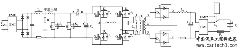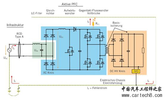 如图3所示,在使用交流充电桩充电过程中,交流充电桩和车辆耦合器与公共电网相连,桩内如果由于绝缘破坏,可能产生工频交流漏电流。在电动汽车部分,可能产生的漏电流主要来自于车载充电机漏电,充电机一般拓扑主要为AC/DC和DC/DC两部分。如下图所示为一种常见车载充电机的主电路图。
