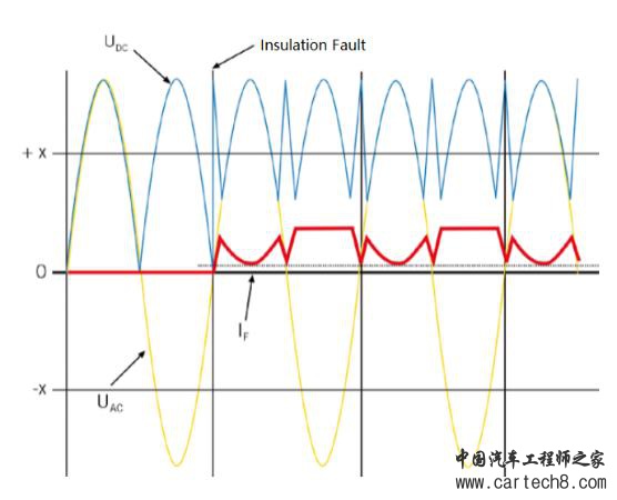 可以看到在后端发生直流漏电之后,也会影响到前级电路,整流过后的脉动直流波形发生畸变,产生尖刺,逐级对后端电路产生干扰,影响到充电效果,甚至影响蓄电池寿命。另一方面,由于TN系统的存在,这种故障不会在车身形成较大电压,对人体危害较小,然而如果连接系统地线缺失或者PE线断开,那么这部分电压就会伤害到人体。实际上国内很多地方尤其农村地区PE线地线的连接都存在问题。现有的A型RCD仅能在检测脉动直流漏电时不受直流6mA电流的干扰,而无法检测到直流漏电并断开保护,当直流漏电大于6mA时,由于直流剩余电流会引起磁芯预先磁化,使脱扣值增大,导致A型RCD无法正常动作,因而必须使用B型RCD进行保护!