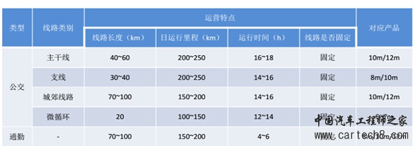 满足客车运营商对产品的4个基本要求,实际上是非常困难的事情。目前运营里程是基于一天运营时间来确定的。运营公司每一天是基本上安排2班,即16个小时以上的运营时间。城市公交车的平均运营速度一般在35公里左右/小时,运营客车(或长途班车)平均运营速度一般在80公里左右/小时。于是基本上可以测算成出,客车一天运营里程数据。所以说续航里程与运营里程的匹配是一个关键点。燃油车目前持续里程基本是是大于运营里程。以下是大数据分析提供的运营里程: