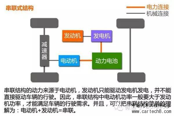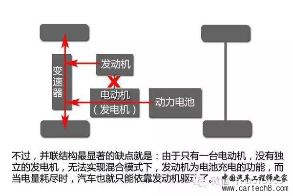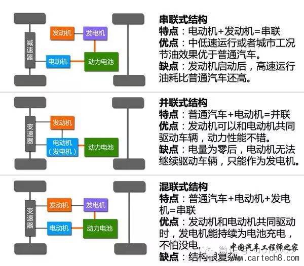 我们把混合动力分为普通混合动力、插电式混合动力以及增程式混合动力三种。而混合动力汽车的结构形式也能分为三种,分别是串联式、并联式以及混联式,其中增程式混合动力只能是串联式结构,而并联式和混联式结构既可以应用于普通混合动力,也可以应用于插电式混合动力。(请各位网友知悉以下简写:串联式结构=串联、并联式结构=并联、混联式结构=混联、混合动力=混动)