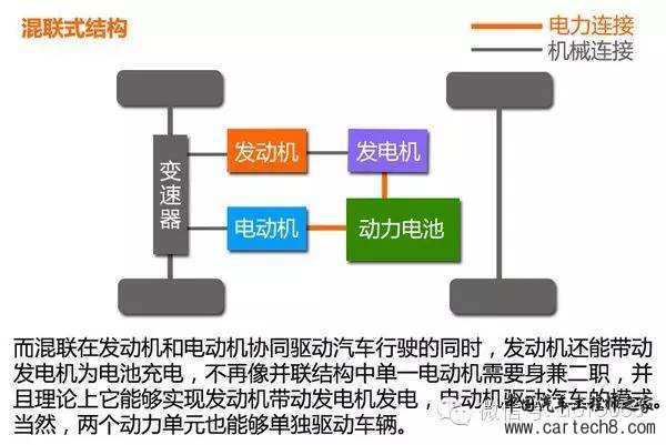 在并联的基础上再加入一个发电机,就是混联了,即普通汽车+电动机+发电机=混联。但它不具备普通人眼里的变速箱,通常是一种所谓“ECVT”的行星齿轮结构的耦合单元替代了变速箱,起到连接、切换两种动力以及减速增扭的作用。也有一些厂家在混联结构中使用普通的变速箱,如双离合变速器、无级变速器(CVT)等,但是效果远不及这种ECVT变速结构。