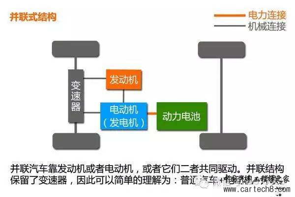并联,实际上就是在普通汽车的基础上加装一套电能驱动系统(即电动机和动力电池),发动机和电动机都能单独驱动车轮,也可以同时工作,共同驱动汽车,当动力电池电量不足时,发动机还能带动电动机反转为电池充电。