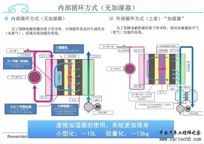 当你踩下油门的时候,车的系统,就会促使氢气通过燃料电池的阳极板发生反应。在这点上,氢气就被分解成为质子和电子,质子就会通过质子交换膜到达负电荷而发生反应。接着,又和氧气发生反应,然后产生了电能,其副产品就是水。这个过程中产生的电就被储藏在蓄电池里,也就是锂电池,可以提供转矩和推进力。