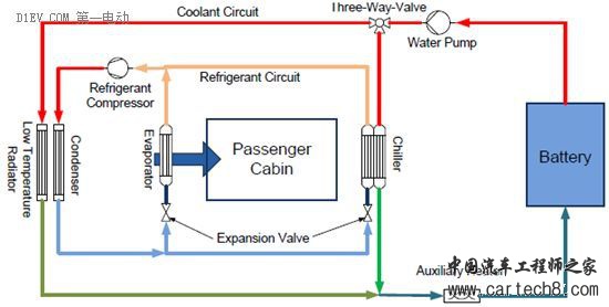 如前所述,电池的化学性能受环境的温度影响非常大,为了保证电池的使用寿命必须让电池工作在合理的温度范围之内,并根据不同的温度给整车控制器得出其所能输出和输入的最大功率。对于电池系统的温度控制主要用到CFD仿真分析,如前所述的温度传感器这一单元,如何使用最少的传感器来有效的监测整个电池包的温度分布,并将监测信息反馈给电池管理系统和整个电池温度管理系统。如图12,电池模组的热分析结果,图13为某液冷系统的,整车和电池系统的散热和加热系统。