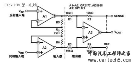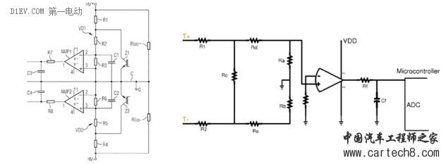 由于这里牵涉到了高压采集,需要进行隔离,所以一般的办法有两种,光隔如AVGAO的芯片方案或者通过电阻分压,然后配置工作点,再加上汽车级运放所组成的仪表运放电路,如下图4所示。