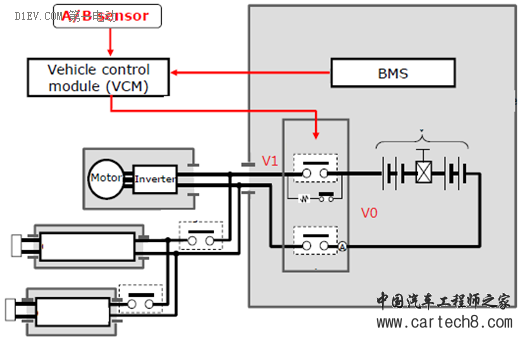 在后续计算SOC的时候,往往会用电池组的总电压来核算,这是计算电池包参数重要参量之一;如果由单体电压累加计量而成本身电池单体电压采样有一定的时间差异性,也没办法与电池传感器的数据实现精确对齐,因此往往采集电池包电压来作为主参数来进行运算。在诊断继电器的时候,是需要电池包内外电压一起比较的,所以这里一般测量电池包电压至少有两路V0和V1,如图3所示。
