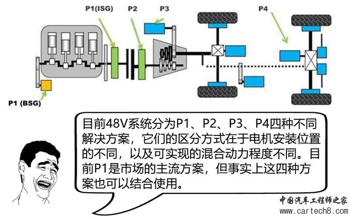P1集成于内燃机,P2安装在内燃机和变速箱之间,P3安装在变速箱,P4安装在后轴。不同的解决方案都有自己的一套技术要领,此处不展开说明。
