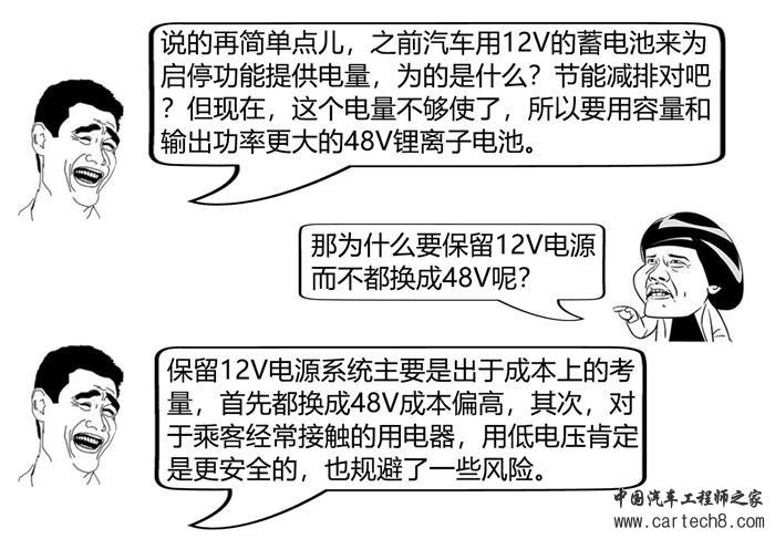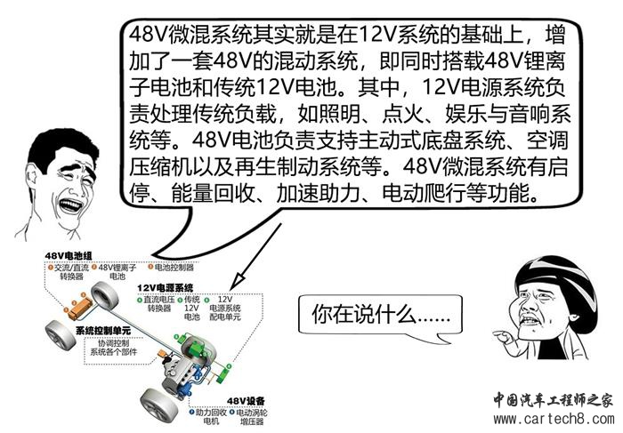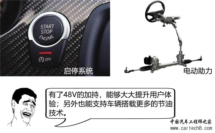 为达到这些标准,车企们通过各种技术革新来进一步提升燃油经济性、降低排放,12V微混达不到5.0升/百公里的要求,这样一来,车企只好再辟蹊径,选择48V混合动力系统来做一个高性价比的解决方案,