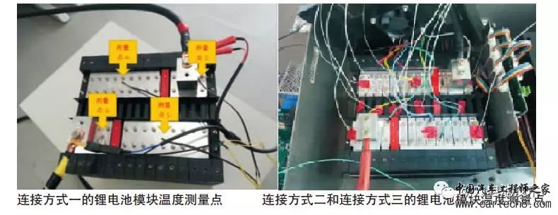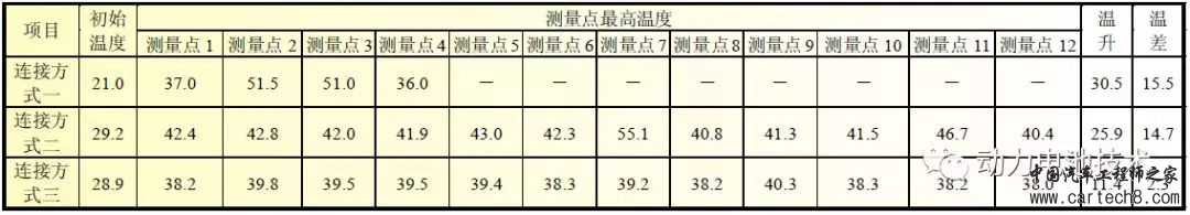 经过实验测试,连接阻抗和锂电池模块内阻如表2 所示。不同连接方式的锂电池模块经过120 A 充放电(一个充放电循环)实验,其测量点的温度测试结果如下表所示。
