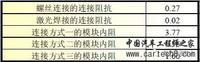 测试方法,单独测试螺丝连接和激光焊接的连接阻抗,各取一块短连接排与一节锂电池分别做螺丝连接和激光焊接实验,测量记录下各自的连接阻抗。同时通过测量锂电池模块正负极两端来得到整个模块的内阻值,从而比较不同连接方式下锂电池模块的内阻差异。连接阻抗和内阻均采用HIOKI 电池测试仪测量获得。