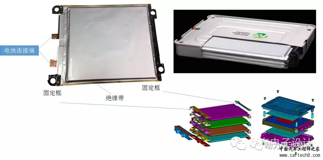 软包电池,各家设计选择差距比较大,上图中式一种较为典型的形式,其基本组成包括:模组控制请(常说的BMS从板),电池单体,导电连接件,塑料框架,冷板,冷却管道,两端的压板以及一套将这些构件组合到一起的紧固件。其中两端的压板除了起到聚拢单体电芯,提供一定压力的作用以外,往往还将模组在pack中的固定结构设计在上面。