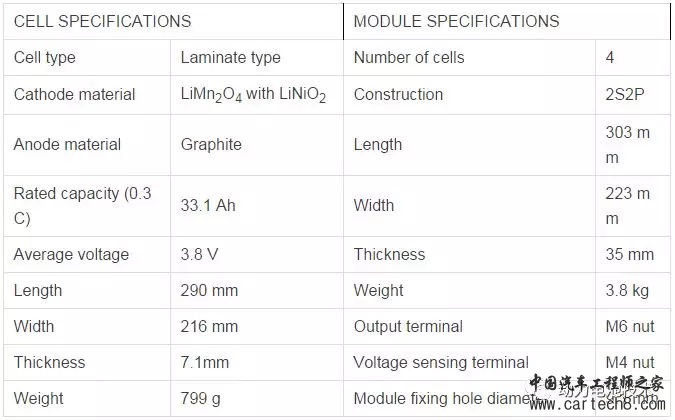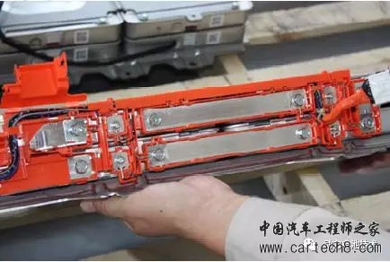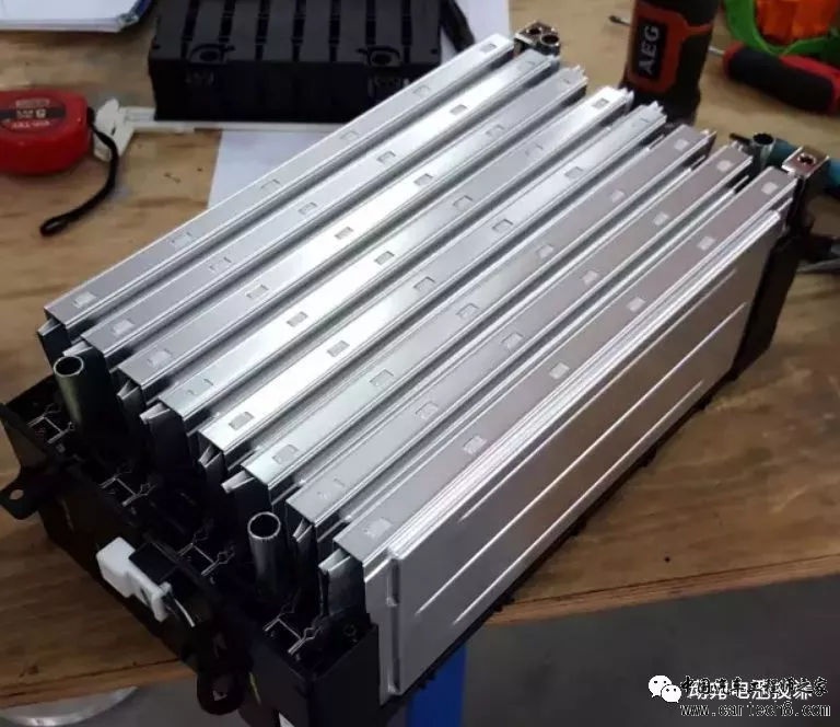 Leaf 电池小模组,每个壳体内放置4只电芯;小模组与小模组之间依靠注塑连接件连接。每个模组极柱的接线端,根据每个模组的数量,专门注塑定制了相应的接线盒,每个接线盒的形式与模组是一一对应的。如果模组内电芯(2p2s)数量改变,其接线盒就不能使用,除非数量是已有模组的整倍数,而且并列模组数一致。例如,如果一个模组是4×2(个电芯)的,那么改动后的模组就必须是8×2、12×2……,否则其原有电极接线盒就无法使用。
