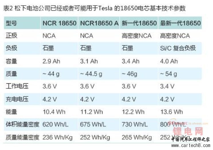 Tesla采用的是松下电池公司的18650标准尺寸圆柱电芯。早期的Tesla 型号使用LCO为正极的18650电芯,Model S改用NCA作为正级材料,电芯容量也从最初的2.9Ah提升到3.1Ah (见下表)。