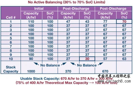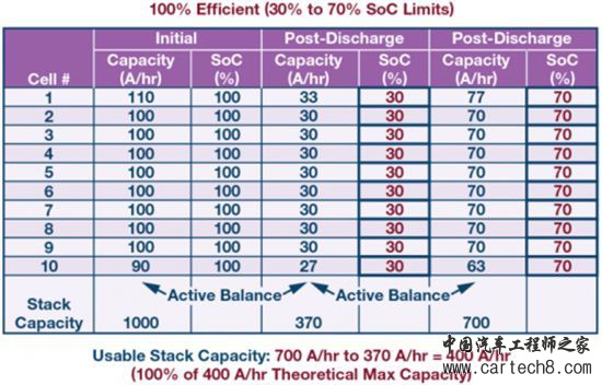电池单元间的容量或SoC不匹配可能会严重降低电池包可用容量,除非均衡电池单元。为使电池包容量最大化,要求在电池包充电和放电期间,电池单元是均衡的。在图2所示的例子中,一个10单元串联电池包由(标称)100 安时电池单元组成,最小容量单元与最大容量单元的容量误差为±10%,对该电池包充电和放电,直至达到预定SoC限值。如果SoC值限制在30%和70%之间,并且不进行均衡,则经过一次完全充电/放电循环之后,电池包可用容量相对于理论可用容量减少25%。被动均衡理论上可以在电池包充电阶段均衡各电池单元的SoC,但在放电期间,无法阻止第10个单元先于其他单元达到30%的SoC水平。即使在电池包充电期间进行被动均衡,在电池包放电期间也会损失可观的容量(不可用)。只有主动均衡解决方案才能恢复容量,在电池包放电期间将电荷从高SoC单元重新分配给低SoC单元。