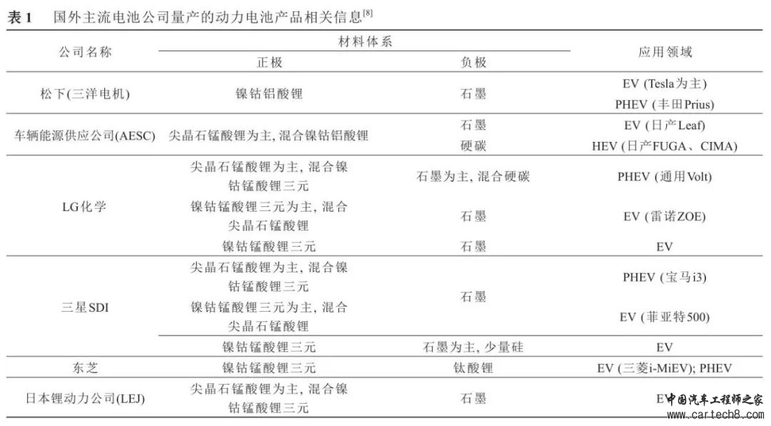 从产业发展情况来看, 目前世界知名的电动汽车动力电池制造商包括日本松下、车辆能源供应公司(AESC)、韩国LG化学和三星SDI等都在积极推进高比能量动力锂离子电池的研发工作. 综合来看, 日本锂电池产业的技术路线是从锰酸锂(LMO)到镍钴锰酸锂三元(NCM)材料. 例如, 松下的动力电池技术路线早期采取锰酸锂, 目前则发展镍钴锰酸锂三元、镍钴铝酸锂(NCA)作为正极材料, 其动力电池主要搭载在特斯拉等车型上. 韩国企业以锰酸锂材料为基础, 如LG化学早期采用锰酸锂作为正极材料, 应用于雪佛兰Volt车型, 近年来三星SDI和LG化学已经全面转向镍钴锰酸锂三元材料(表1)。