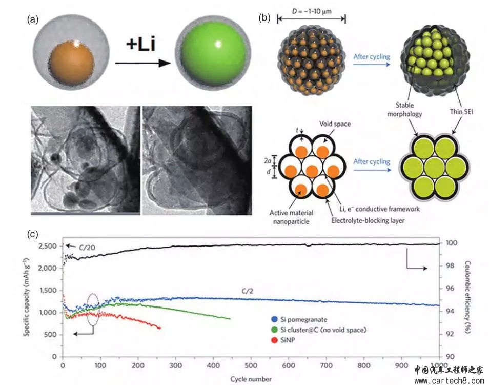 图 5 具有蛋黄蛋壳的结构的硅碳复合锂离子电池负极材料 . (a) 蛋黄蛋壳的结构合成示意图及TEM图; (b) 类石榴的结构合成示意图; (c) 硅纳米粒子、 蛋黄蛋壳结构硅碳复合材料、类石榴结构硅碳复合材料的循环性能对比 (网络版彩图)