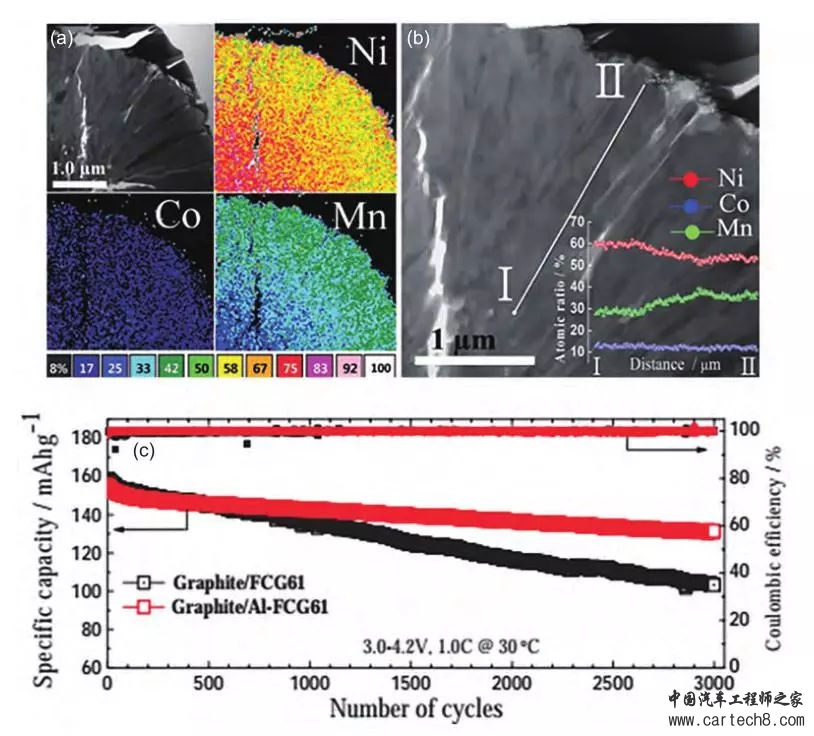 (2) 开发具有浓度梯度的高镍三元体系。Sun课题组 采用共沉淀方法制备了具有双斜率浓度梯度三元材料,如图4所示, 这种材料的内部具有更高含量的镍, 有利于高容量的获得和保持, 外层有更高含量的锰, 有利于循环稳定性和热稳定性的提升. 通过Al掺杂, 具有浓度梯度的LiNi 0.61 Co 0.12 Mn 0.27 O 2 在经过3000次循环后,其容量保持率从65%大幅度提高到84%.