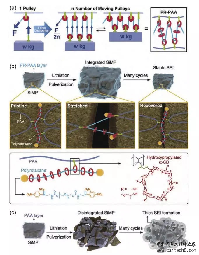 图 6 SiMP负极PR-PAA黏结剂的应力释放机理. (a) 减小提起物体用力的滑轮机理; (b) PR-PAA黏结剂用于缓解因硅颗粒充放电过程中体积变化而产生应力的示意图; (c) 充放电过程中PAA-SiMP电极破碎和生成SEI膜的示意图 (网络版彩图)