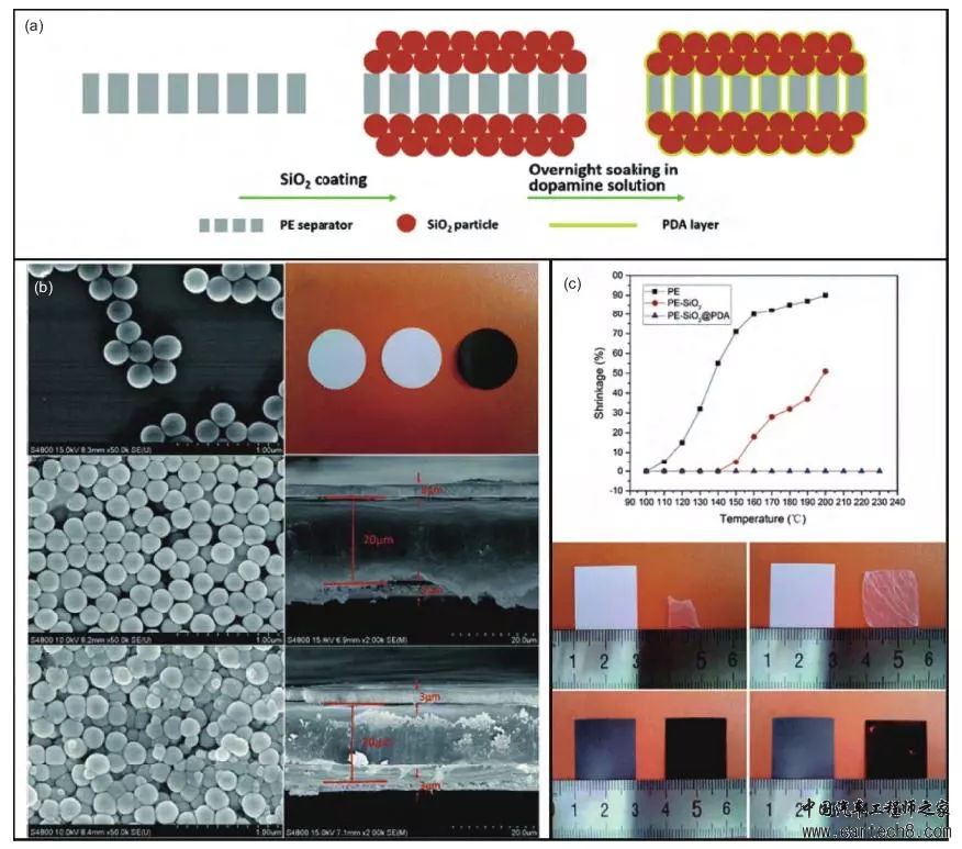 .图 7 包覆上耐高温聚多巴胺保护层的SiO 2 陶瓷隔膜。(a) 隔膜结构及合成示意图; (b) 隔膜形貌表征; (c) 隔膜热收缩性能对比(网络版彩图)