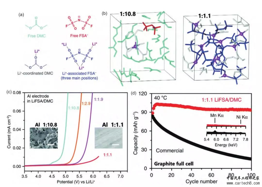 图 3 具有良好电化学稳定性的用于高电压LiNi 0.5 Mn 1.5 O 4 材料的LiFSA/DMC电解液体系. (a) LiFSA/DMC混合电解液中的组分结构示意图; (b) 两种不同配比情况下, 溶剂分子典型平衡轨迹的DFT-MD模拟; (c) 铝电极在LiFSA/DMC混合电解液中的高电压稳定性; (d) 全电池在40°C, C/5倍率下的循环性能(网络版彩图)