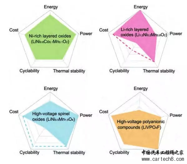 图 2 比较各种类型的高电压、高容量正极材料的体积能量密度、功率、循环性、成本和热稳定性的雷达图 (网络版彩图)等)
