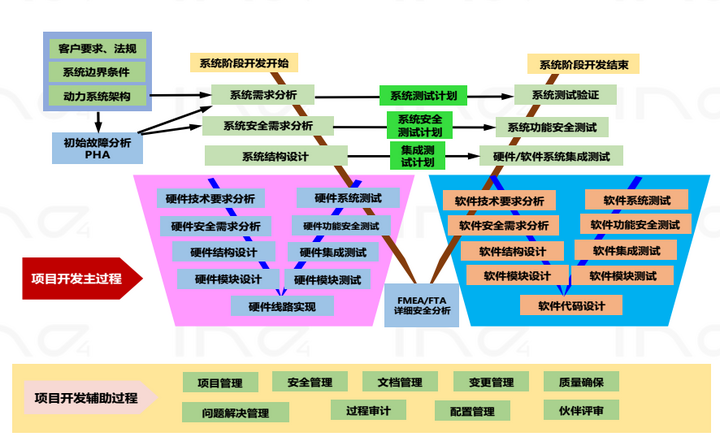 高质量、高安全的动力电池如何判定呢?必须要掌握电池管理系统(BMS)的“理”是什么?如何表现?好的电池管理系统一定要按照ISO26262国际标准研发、开发的。ISO 26262标准的目的是使得人们对安全相关功能有一个更好的理解,并尽可能明确地对它们进行解释,同时为避免这些风险提供了可行性的要求和流程。主要是双V模式(见图4)。