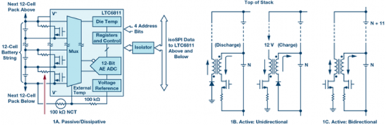 如图1a所示,被动均衡既简单又便宜。然而,被动均衡也非常缓慢,会在电池包内部产生有害的热量,均衡结果是将所有电池单元的剩余容量减少到与电池包中SoC最低的电池单元一致。此外,被动均衡缺乏能力有效解决另一种常见现象——容量不匹配引起的SoC误差。所有电池单元在老化时都会损失容量,损失速率往往不同,原因类似于串联电池单元的充电状态随着时间推移而出现差异。电池包电流均等地流入和流出所有串联电池单元,因此电池包的可用容量取决于电池包中容量最低的电池单元。只有图1b和图1c所示的主动均衡方法可以让电荷在整个电池包中重新分配,补偿电池单元间不匹配所造成的容量损失。
