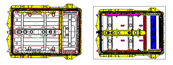 “三”大结构,框架结构设计不同,功能定义非常明确。例如,内框架主要任务是完成模组的承载,例如可以采用1.5mm、1.8mm 中高强钢完成;外框架结构,类似于内框架设计要求,只不过它的作用是对系统的承载,通过支架,完成和车身的装配结合;防护面板(含下壳体防护面板、上盖板),下壳体防护板,在内、外框架之间,没有承载作用,只是完成对系统的防护和封闭。这时候,因为不承担重量,板材可以做的很薄,leaf 板材厚度实测0.7mm(磨漆后)。大大减轻了系统结构重量。其上盖板尽管板材薄,但感觉没有变形,强度很好。这就是通过设计达到的目标。