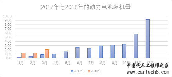 以2017年为例,从年初到年底,动力电池装机量呈高速上涨趋势:第一季度由于补贴的技术标准提高,企业存在一个明显的适应期,2017年1月的总装机量只有176MWh,2月高速上涨了169.68%,3月又高速上涨了 96.35%。到了第二季度,动力电池装机量在4月突破了1GWh,然后在5-6 月平均涨幅为60.47%。第三季度出现平稳过渡。第四季度因为补贴政策调整传闻造成了年底的抢装,最后两个月动力电池装机量平均上涨了65.68%, 特别是12月拉出了一个明显的翘尾。
