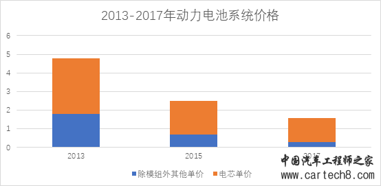 国产第一代纯电动汽车动力电池系统 2013 年开始量产,采用磷酸铁锂电芯,系统单价高达 4.8 元 /Wh,其中除模组外的系统材料和制造成本约为 1.8 元 /Wh。