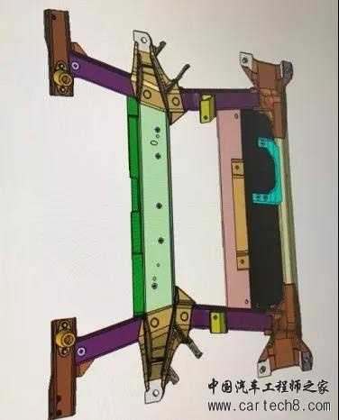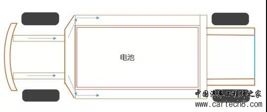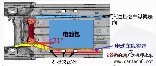 为在地板下面布置更大的动力电池,现在电动汽车的发展趋势是在整车长度一定时,尽量增加轴距和缩短前后悬。前悬缩短将导致前舱碰撞吸能空间进一步恶化。