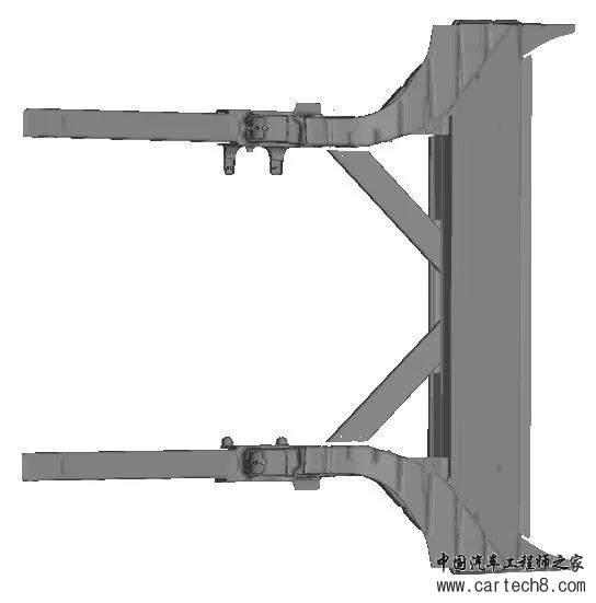 另外,前纵梁前端吸能盒和副车架延伸梁的变形次序必须严格控制,副车架延伸梁的变形应滞后于吸能盒。这样在低速碰撞时仅有吸能盒变形,副车架延伸梁不发生变形,从而保证了低速碰时车辆的可维修性。