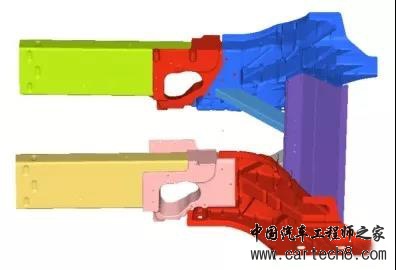 无论是地板纵梁方案还是前纵梁加深方案,前纵梁根部都是最值得关注的部位,应进行多重强化设计,并增加斜向支撑和前壁板底部横梁。