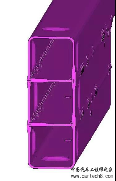 挤压铝前纵梁的壁厚可以根据需要自由设计,而且截面内部可以设计多条加强筋,即使采用很大的高宽比,也有办法保证Y向的稳定性。例如特斯拉Model X的前纵梁截面,如图8所示,其高宽比已经超过3.0,但它通过合理设计内部加强筋,保证了正碰时的稳定性,无论是100%正碰还是40%偏置碰,都能实现良好的溃缩。