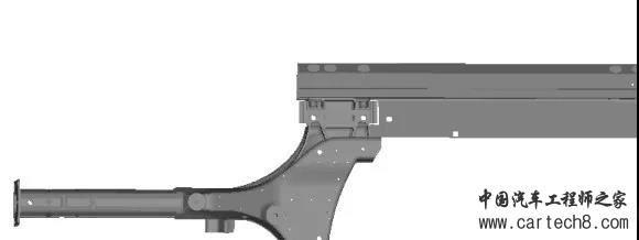 除上述传力路径外,副车架-前纵梁根部-门槛梁为第二条正碰传力路径。如果副车架向前延伸出300mm左右的可溃缩小纵梁,如图10,发生正面碰撞后,延伸梁能够分担一部分截面力,跟前纵梁一起溃缩,使碰撞初期的整车加速度有所提升,因此同样的变形距离下能够吸收更多的能量。