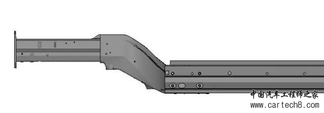 第二种方案以减少Z向间距为目标,前纵梁尽量向下加大截面高度,这种方案我们称为前纵梁加深方案。前纵梁横截面Z向尺寸相比传统车增加50-80mm,前纵梁下表面与门槛梁下表面的Z向间距减少到170mm以内。