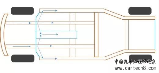 地板纵梁方案最大的缺点是地板纵梁的存在导致动力电池宽度受限,电池宽度只能达到车身宽度的60%左右,必然影响整车续驶里程。