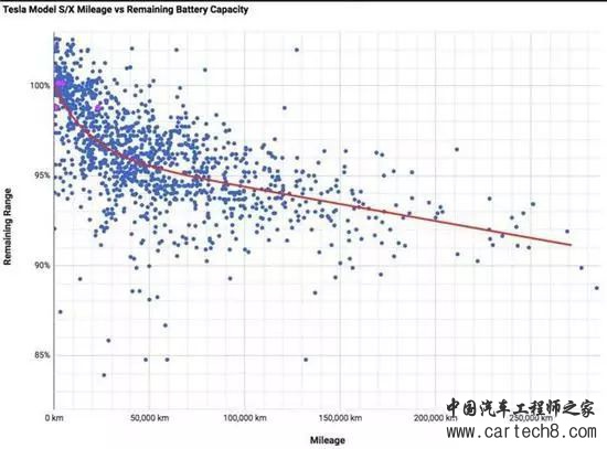 目前,据趋势线显示,特斯拉车载蓄电池或在充放电30万次(平均值)以上后,其电池容量才会衰减至原始电池容量的90%。