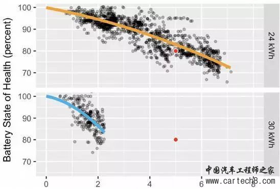 他(她)们将部分处于异常值(outlier)的蓄电池组剔除在外,然后将直流快充及每日的充电状态等其他数据纳入考量范围,想找出电池衰减的原因及各因素间的关联性。然而,目前还没有迹象表明这类因素会对其数据造成重大影响。